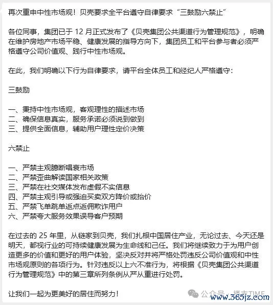 近日,一份名为《再次重申中性市场观!贝壳要求全平台遵守自律要求“三鼓励六禁止”》的文件,在房产群里流传。