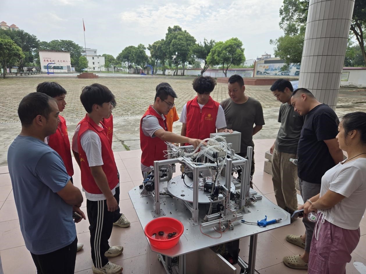 作为顿岗镇的特色产业,马蹄种植面临“削皮难”困境,“老人干不动、青年人不愿干”的现状制约着产业发展。去年暑假,实践团队带着第一代马蹄去皮机赴顿岗镇助农,收集了一系列亟待解决的问题:插针留孔影响卖相、效率不高、去净率时好时坏、异形马蹄难处理……面对这份来着生产一线农户反馈的“问题清单”,团队师生迎难而上,广泛查阅资料,明确技术攻关“任务书”,一头扎进实验室,反复优化设计方案、调试机械结构、改进控制系统。经过近一年的攻关,第二代马蹄去皮机在效率、稳定性和适应性显著提升,更贴合农户需求。